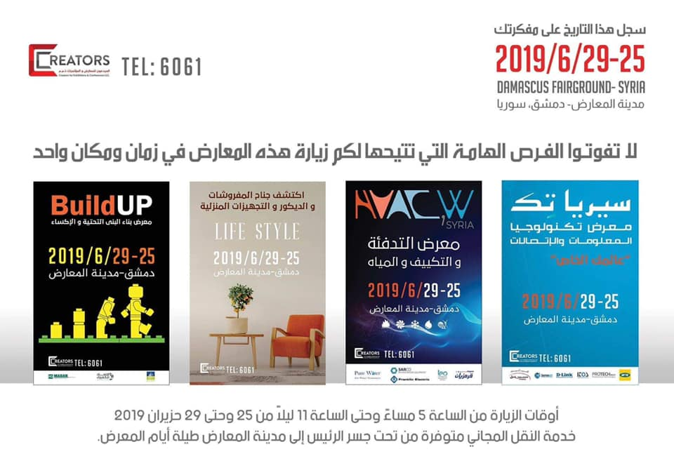 مجموعة المعارض التخصصية التي تنظمها شركة المبدعون للمعارض والمؤتمرات ستشمل إقامة معرض تكنولوجيا المعلومات والاتصالات (سيريا تك) بدورته السادسة بالتعاون مع وزارة الاتصالات والتقانة ومعرض التدفئة والتكييف والمياه والطاقات المتجددة (اتش في ايه سي دبليو) ومعرض بناء البنى التحتية والإكساء (بيلد آب) إضافة إلى جناح المفروشات والديكور والتجهيزات المنزلية (لايف ستايل).