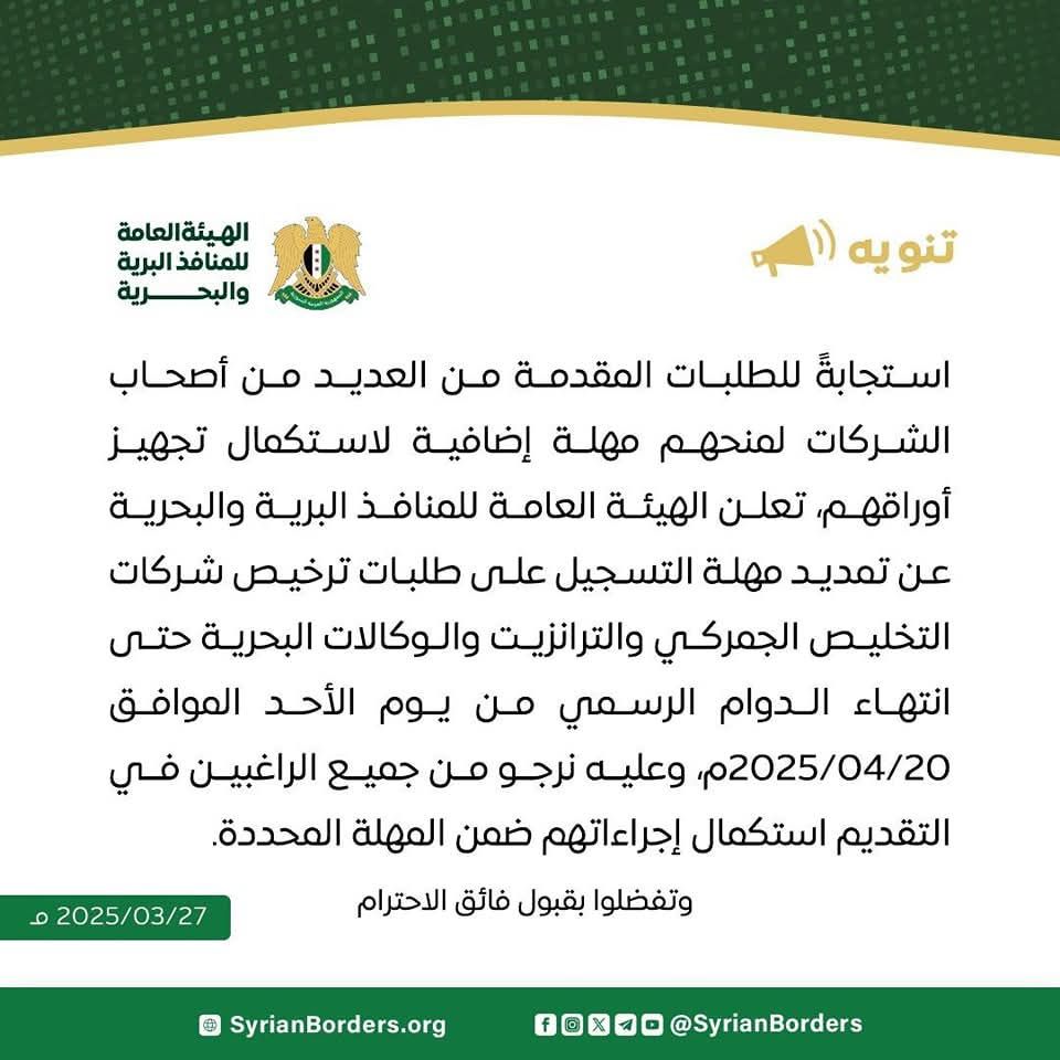 الهيئة العامة للمنافذ البرية والبحرية تعلن عن تمديد مهلة التسجيل لطلبات ترخيص شركات التخليص الجمركي والترانزيت والوكالات البحرية حتى نهاية الدوام الرسمي ليوم الأحد الموافق 2025/04/20م.