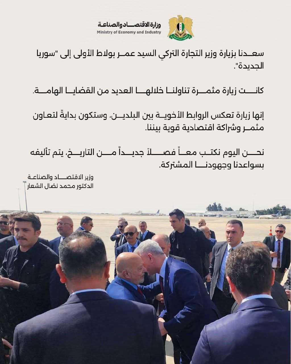 وزير الاقتصاد والصناعة : زيارة وزير التجارة التركي إلى سوريا الجديدة ستكون بداية لتعاون مثمر وشراكة اقتصادية قوية