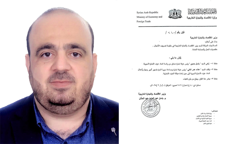 أصدر وزير الاقتصاد والتجارة الخارجية المهندس باسل عبد العزيز عبد الحنان قرارا بتكليف السيد علاء عمر العلي رئيس غرفة تجارة وصناعة سوريا الحرة بتسيير أمور ومهام وأعمال اتحاد غرف التجارة السورية إلى حين إعادة هيكلة الغرف التجارية.